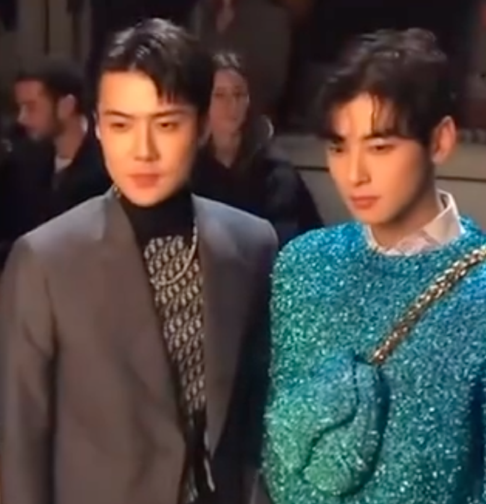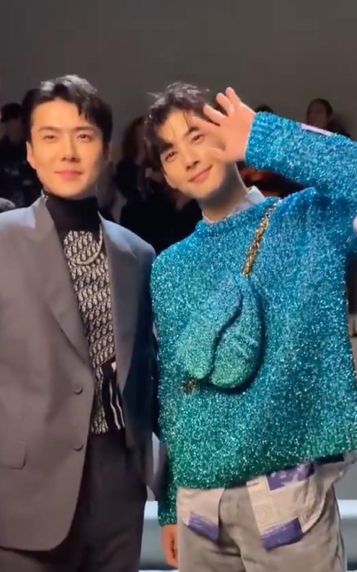 近日,吴世勋车银优同框看秀路透释出,吴世勋身穿灰色西服套装优雅绅士,车银优身穿蓝色毛衣清新活力,二人合照帅气养眼。